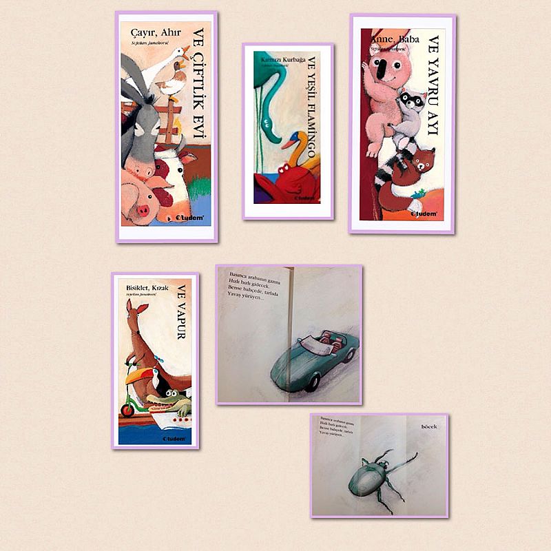 Serinin kitapları : Bisiklet,Kızak ve Vapur, Kırmızı Kurbağa ve Yeşil Flamingo; Çayır, Ahır ve Çiftlik Evi; Anne, Baba ve Yavru Ayı.