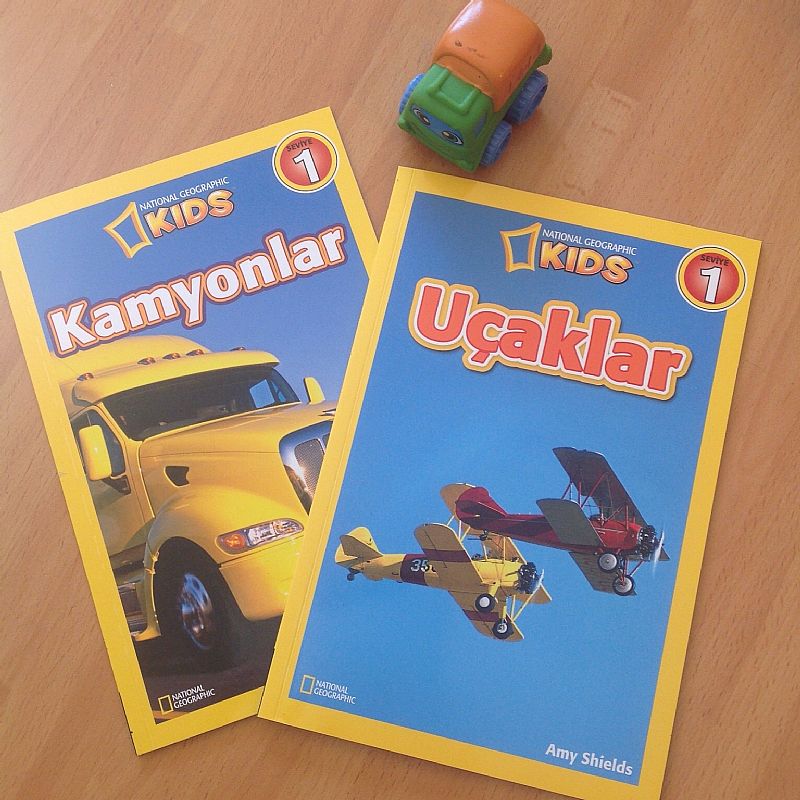 National Geographic Kids´in farklı seviyelerde ilk okuma kitapları var. Örneklerini gördükleriniz seviye 1 yani, yeni okumaya başlayan çocuklar için. Kitaplar resimli ( çizim değil gerçek fotoğraf) az ve büyük punto yazılı... Kamyon ve uçak seven çocuklar için bence alıştırma yapmak için ideal. Tabii ki daha küçüklere de siz okuyabilirsiniz.
