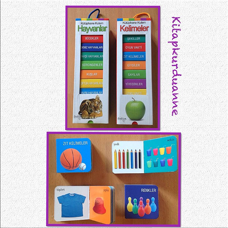 Kütüphane Kuleleri´nin iki çeşidi var birincisi Kelimeler, toplam 8 kitaptan oluşuyor, içinde Şekiller,Oyun Vakti, Zıt Kelimeler, Giysiler, Sayılar, Yiyecekler, Uyku Vakti ve Renkler kitapları var.