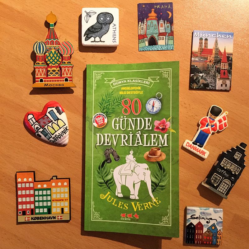 Jules Verne sever misiniz? Bilim kurgu ile edebiyatı birleştiren yazarın klasikleşen eseri "80 Günde Devrialem" yeni bir yorum ile Caretta Yayıncılık´tan dan basıldı. Aslına bakarsanız bu farklı bir seri çünkü içinde sadece hikayeyi okumuyorsunuz, hikaye aralarında hikayede geçen bazı konularla ilgili kısa kısa ilginç ansiklopedik bilgilendirmeler yer alıyor. Masal, bu sene Ak sanat´ta izlediği hikayenin tiyatro oyunundan etkilenmiş olacak ki kitabı evde gördüğünden beri peşinde.. Sayfa sayısı olarak biraz daha beklemesi gerektiğini söyleyip en son ben okuyacağım diye elinden kurtardım. Çok da keyifle okudum. Şu an bu ansiklopedik bilgi destekli klasikler serisinde 80 Günde Devrialem dışında bir de Jack London´ın "Beyaz Diş" hikayesi var, okuyunca onu da paylaşacağım. Bence değişik ve ilgi çekici bir seri olmuş. Masal biraz daha önce okuyacak sanırım ama bence 8 yaş üzeri daha rahat okur. Benim de bir iddiaya girip dünyayı dolaşasım yok değil ??