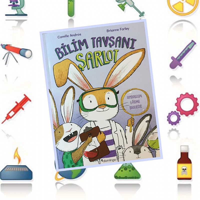 Günaydın??Yeni haftaya Domingo Yayınevi´nin yepyeni okul öncesi kitabı "Bilim Tavşanı Şarlot" ile başlayalım. Şarlot, bütün gün laboratuar önlüğü ile gezen bilime, deneylere meraklı bir tavşan. En büyük problemi ise kalabalık ailesi ile birlikte yaşarken sessiz sakin deneylerini yapacağı bir ortam bulamamak. İşte bu noktada bu onun "problemi". Hikayede Şarlot´un bir probleme bilimsel düşünce yöntemi ile yaklaşarak Soru-Varsayım-Deney-Gözlem-Sonuç sıralaması ile çözüm getirmesine şahit oluyoruz. Tavşanımız çözümü bir uzay gemisi icat edip uzaya gitmek olarak bulsa da acaba orada mutlu olabilecek mi?