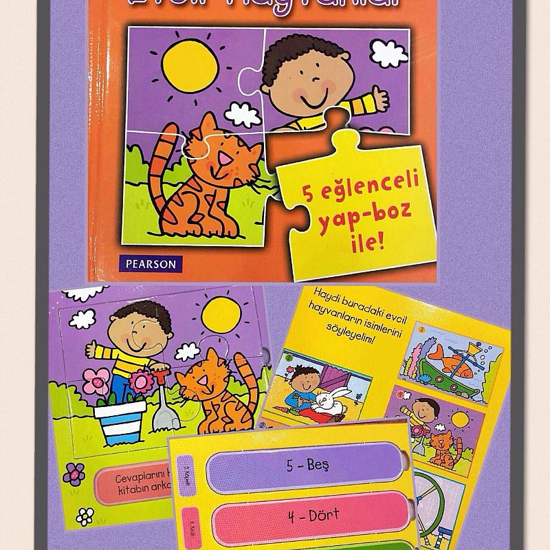Pearson Yayıncılık´tan çıkan "Evcil Hayvanlar Yap-Boz Yapıyorum" kitabı, kalın kartondan içinde her sayfada 4 parçalı yapbozları olan ve evcil hayvanları tanıtan çok güzel bir kitap. İçinde beş adet eğlenceli yapboz var, en arka sayfada da her sayfadaki boşluğa uygun renk, sayı ve şekil içeren bir yapboz sayfası mevcut. 1-1,5 yaş üzeri minikler için eğlenceli bir alternatif