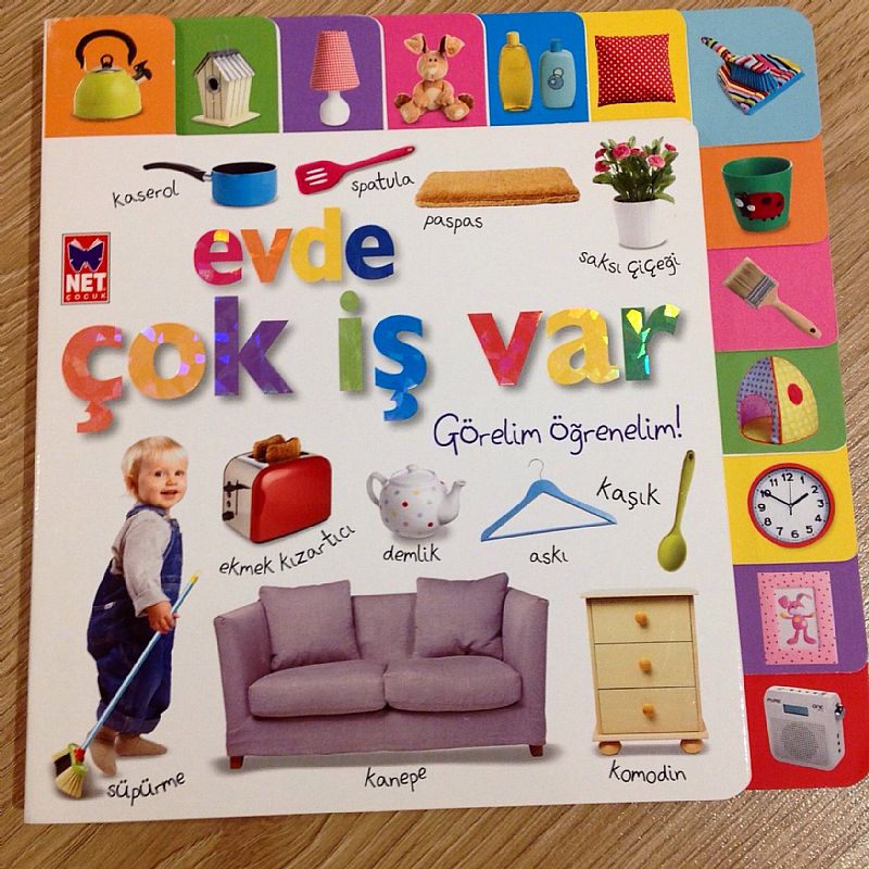 Ben Masal´dan 2-4 yaş arası ev işlerinde çok memnundum, çamaşırları ayırır, makinaya koymaya yardım eder, sonra asmaya ve toplamaya yardım eder, toz bile alırdı. Pek meraklıydı ev işine! Sonra sonra ilgi alanları değişti ve yardımlar azaldı. Şaka bir yana Masal farklı kelime kitaplarıyla ve benim sürekli onla konuşmamla çok fazla kelime öğrendi. Bu kitap, Net Çocuk´tan 1 yaş üzeri için tavsiye ederim.