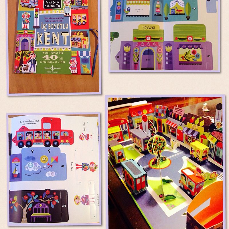 Madem hafta sonundayız, eğlenceli bir maket kitabı da önereyim istedim. İş Bankası Kültür Yayınlarının "Yaratıcı Çocuklar için 3 Boyutlu Kent" kitabı" , sayfalarında fotoğraflarda göreceğiniz gibi esnafından, trafik ışığına ağacından otobüsüne ve insanlarına kadar kesmeden kolayca çıkartarak ve yapıştırıcı olmaksızın küçük bir kent inşa etmenizi sağlıyor. İki ay önce ki Meraklı Minik dergisinden çıkan market oyunu Masal´ın çok hoşuna gidince almıştım, çok sevdi.